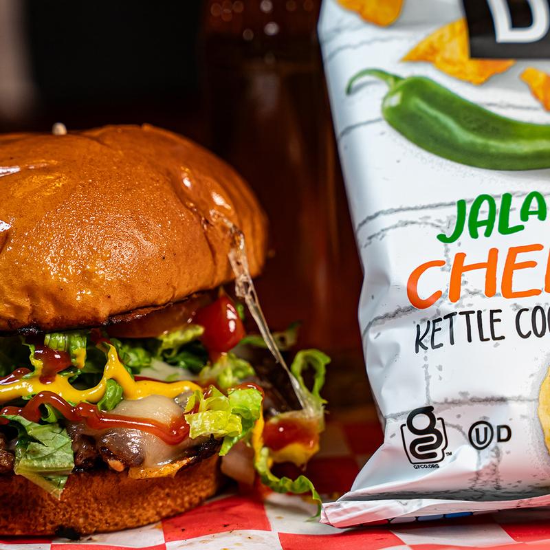 Smash patty, cheddar cheese, red onion, tomato, lettuce, mustard, ketchup, pickle chip, on brioche bun | Make It a Double +$5.00